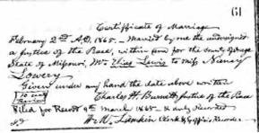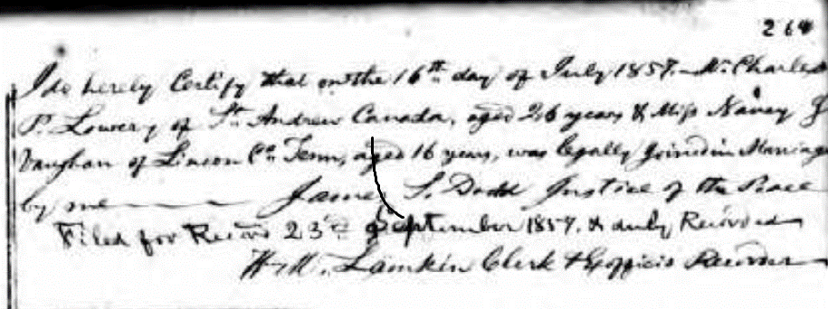 In Osage County, Missouri on July 16, 1857, Nancy J Vaughn from Lincoln County, Tennessee at the age of sixteen married Charles P Lowery (Loughry) from St Andrews West, Stormont, New Brunswick, Canada at the age of twenty-six years old. Nancy and Charles had their first child in 1859 named Edward Lowery (Loughry) in Missouri. Their second child Eliza A Lowery (Loughry) was born in May 1861 in Palestine Township, Cooper, Missouri. Charlesann (Annie) Lowery (Loughry) was born in January 1863 in Missouri.