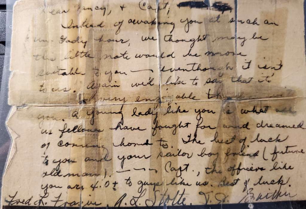 It read in part — Dear Nancy and Capt. ? (her boyfriend at the time) Instead of awakening you at such an ungodly hour, we thought maybe this little note would be more suitable to you — even though it isn’t to us. Again, we’d like to say that it’s been very enjoyable thank you. A young lady like you is what all us fellows have fought for and dreamed of coming home to. The best of luck to you and your sailor boyfriend (future old man —– Capt. the officers like you are 4.0 + to guys like us. Best of luck. Fred L Frazier, A L Stolte, T J Gaither