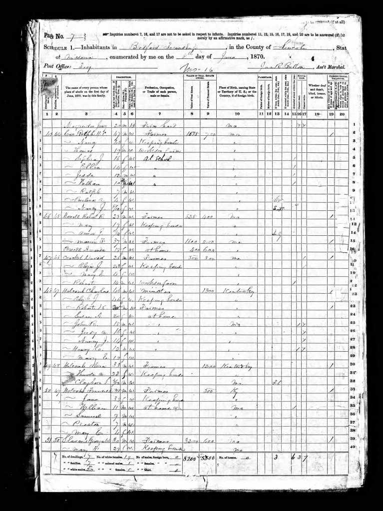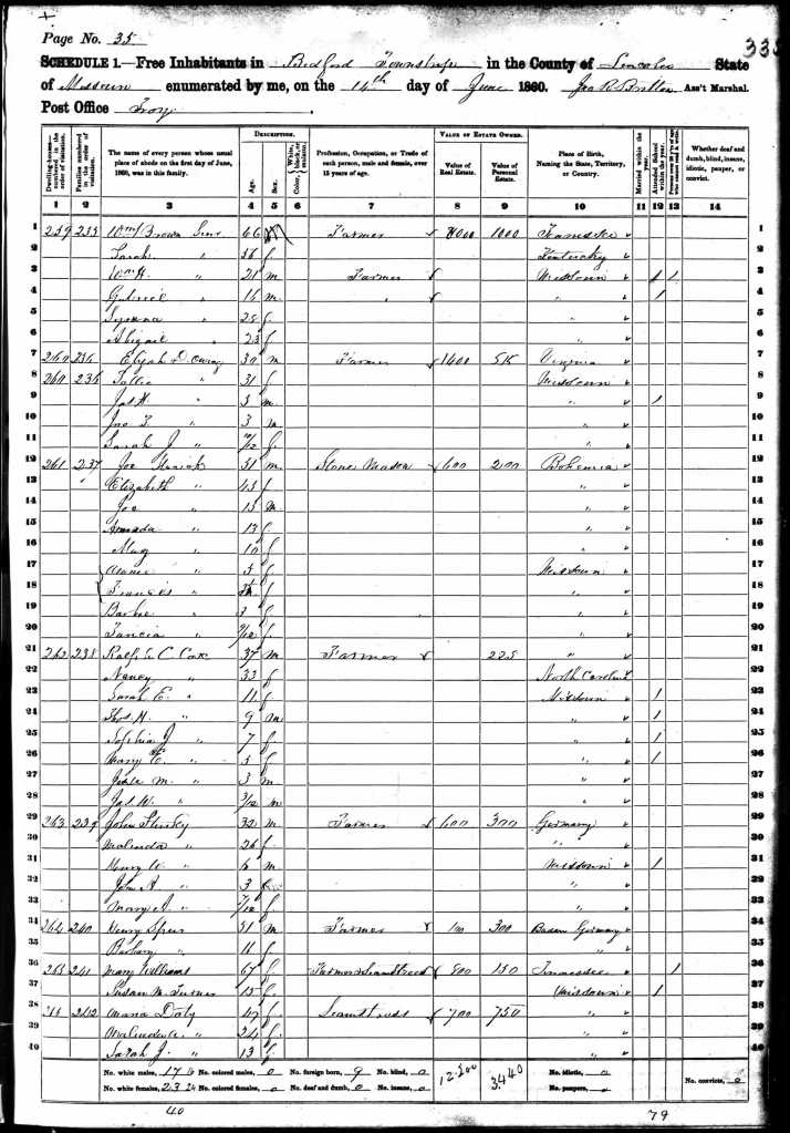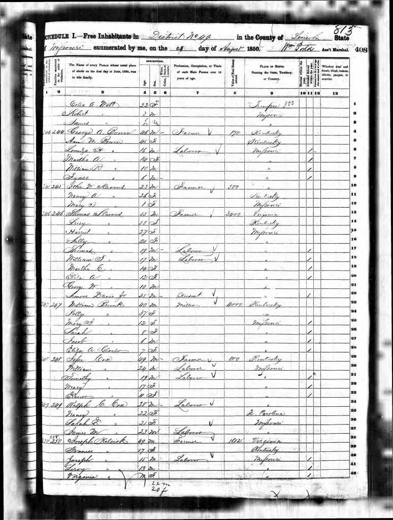 The Missouri 1850 Census shows that her parents were living in Bedford, Lincoln, Missouri, right next door to Ralph’s father and siblings. Ralph’s family consisted of his wife Nancy Baugh Cox and Sarah and James Cox.