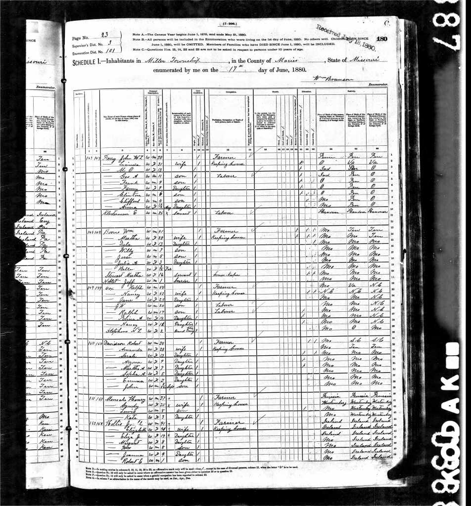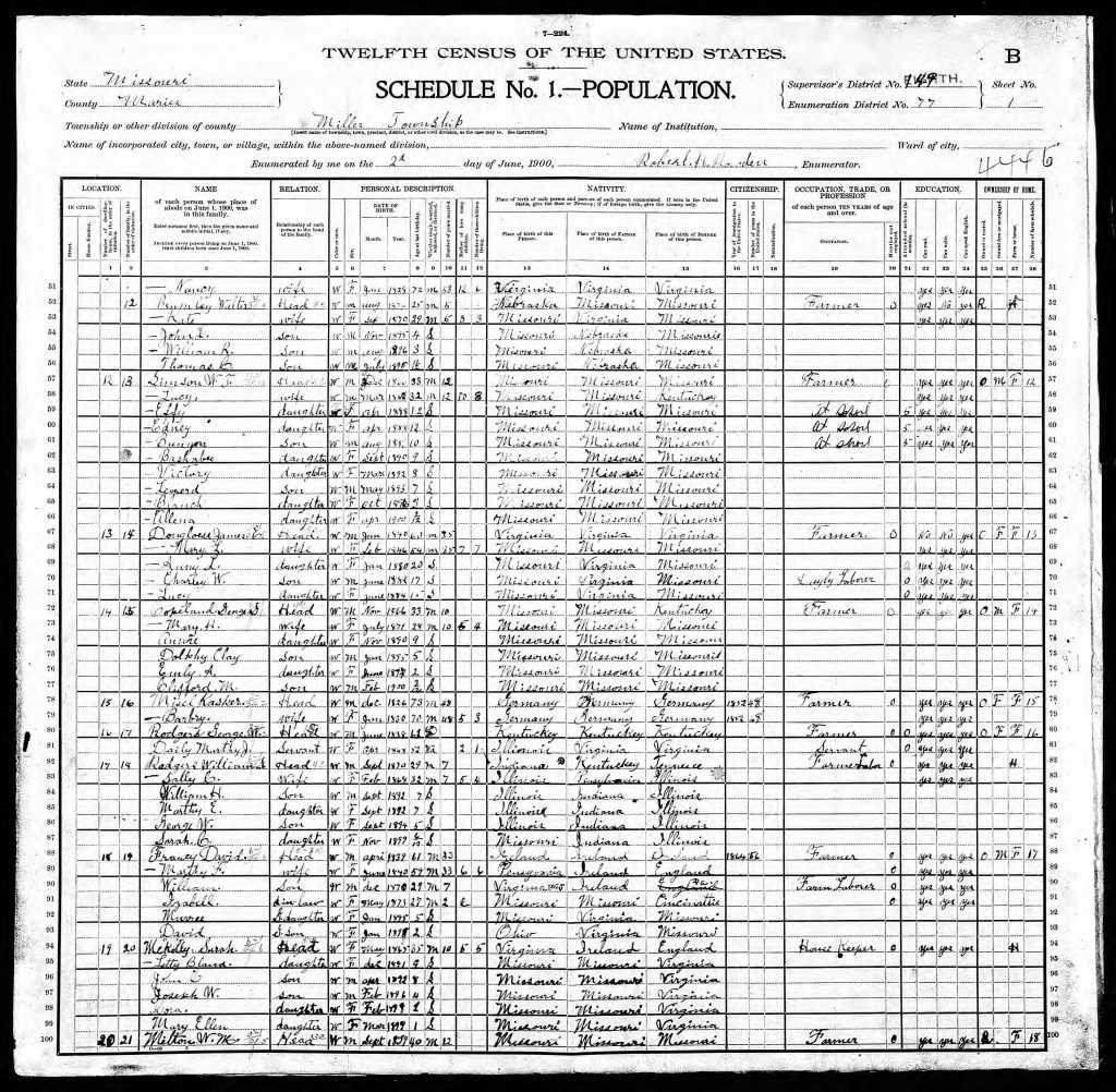 The family expanded after 1895 to William Ralph born August 5, 1897, and Thomas Clinton born July 1, 1899. The Missouri Census finds them living in Miller Township, Maries, Missouri.