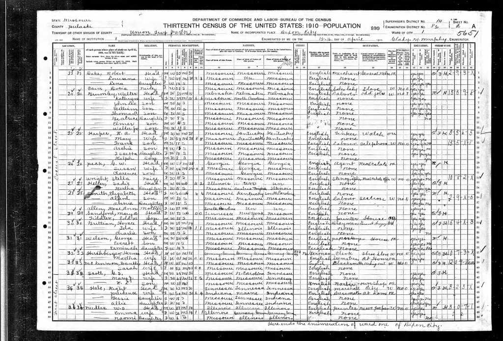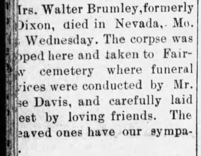 The 1910 Missouri Census places the family in Pulaski County, Missouri where Nancy Beatrice (Bea) was born October 10, 1901, Henry Elmer Raymond born July 11, 1905, and Walter Willis Brumley born July 23, 1908.