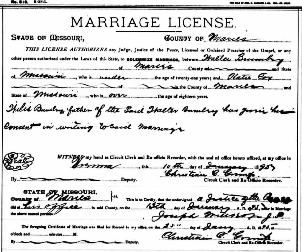 Nancy Katherine (Katie) Cox married Isaack Walter Brumley (my great grandfather) on January 13, 1895, in Maries County. His father had to give consent for them to marry because he was not of legal age. Later that year my grandfather, John Leo Brumley was born on November 16, 1895, in Dixon, Pulaski, Missouri.