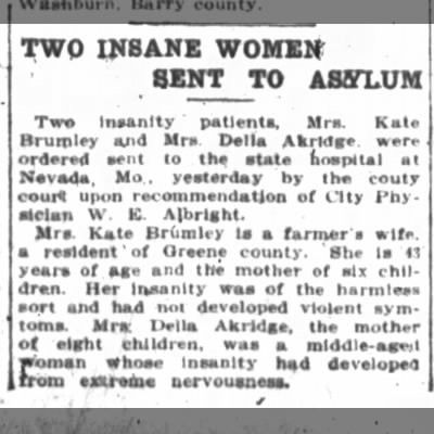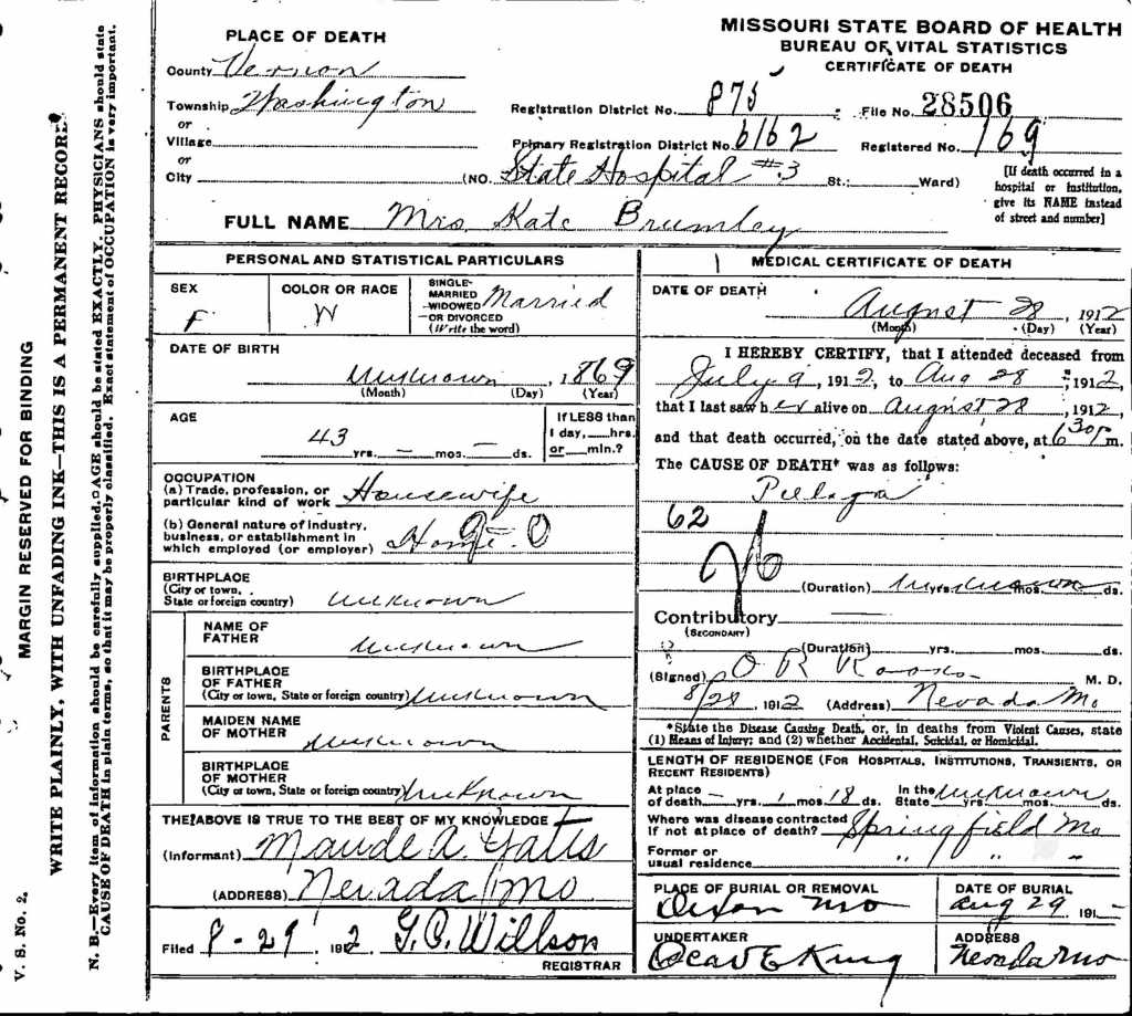 It was after 1910 that Nancy Katherine Cox Brumley probably began to suffer from Pellagra. Pellagra was a disease caused by the lack of the vitamin niacin (vitamin B3). Symptoms are inflamed skin, diarrhea, dementia, and sores in the mouth. This disease became so bad that and without a cure at the time or that they could afford, she was sent to the Nevada State Hospital in Nevada, Vernon, Missouri.